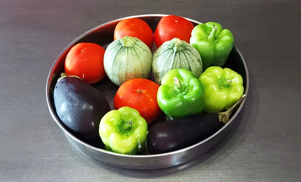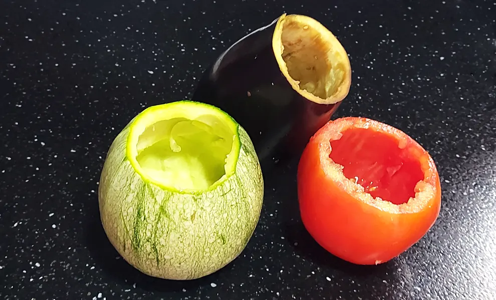 - У вибраних овочів зріжте «шапочки» й очистіть серцевинки ложечкою. З перців та баклажанів нутрощі викидаємо, а з кабачків і помідорів залишаємо для начинки. У випадку баклажанів можна зрізати «шапочки» вертикально (як на фото) або горизонтально (якщо у вас немає спеціальних пристосувань для видалення серцевинки).