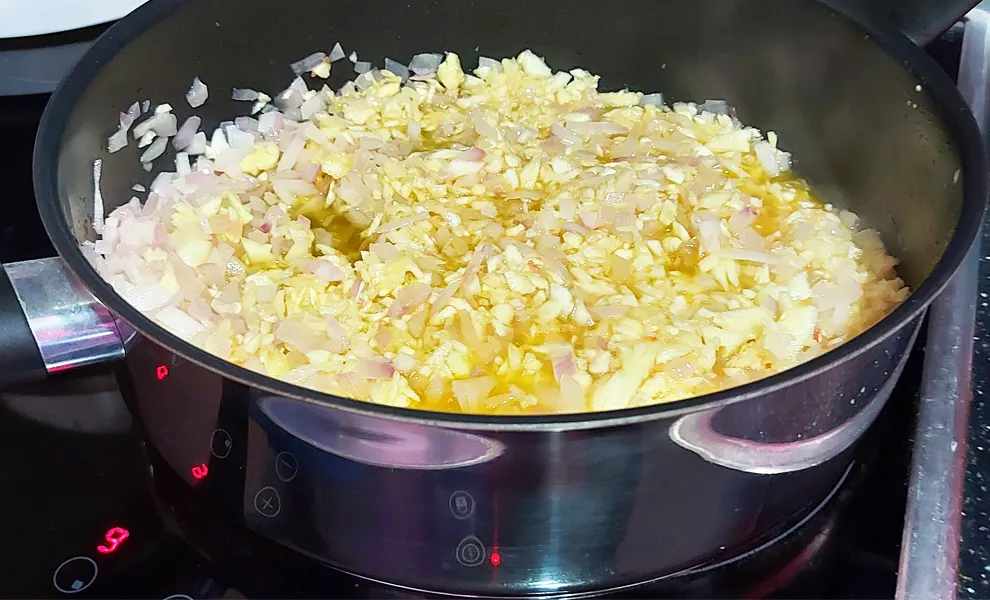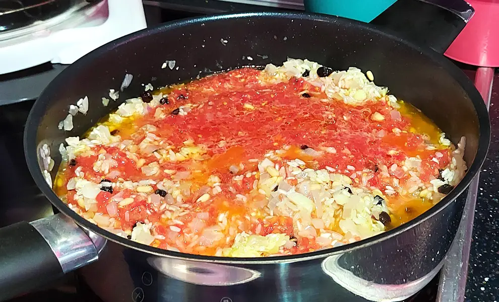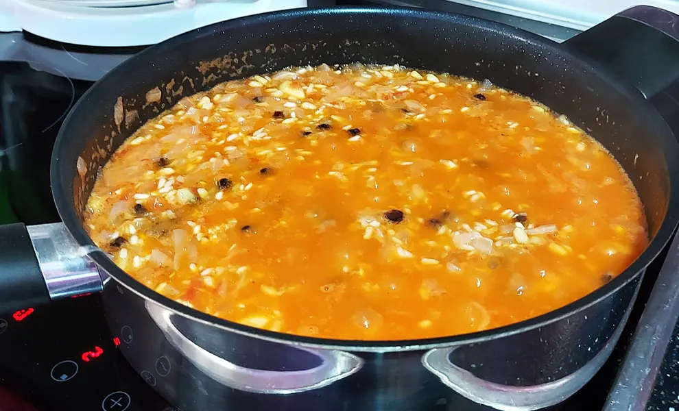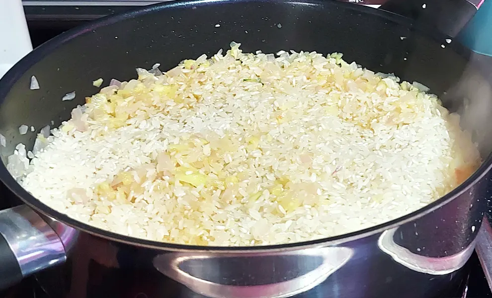 - Додайте рис (не промиваючи) та обсмажуйте його близько 4 хвилин.