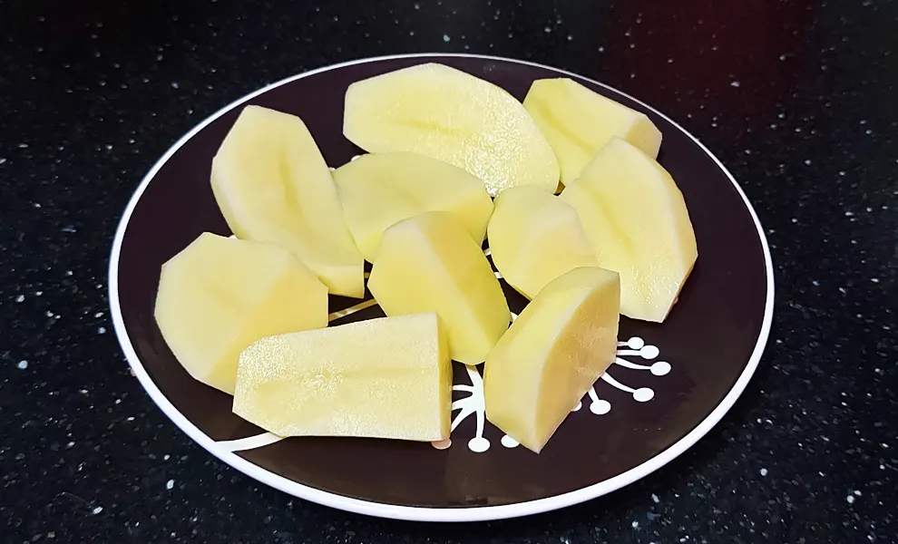 - Картоплю наріжте вертикальними половинками або четвертинками залежно від розміру. Якщо є, то краще використовувати молоду разом зі шкіркою.