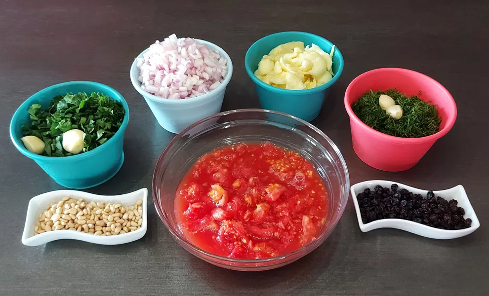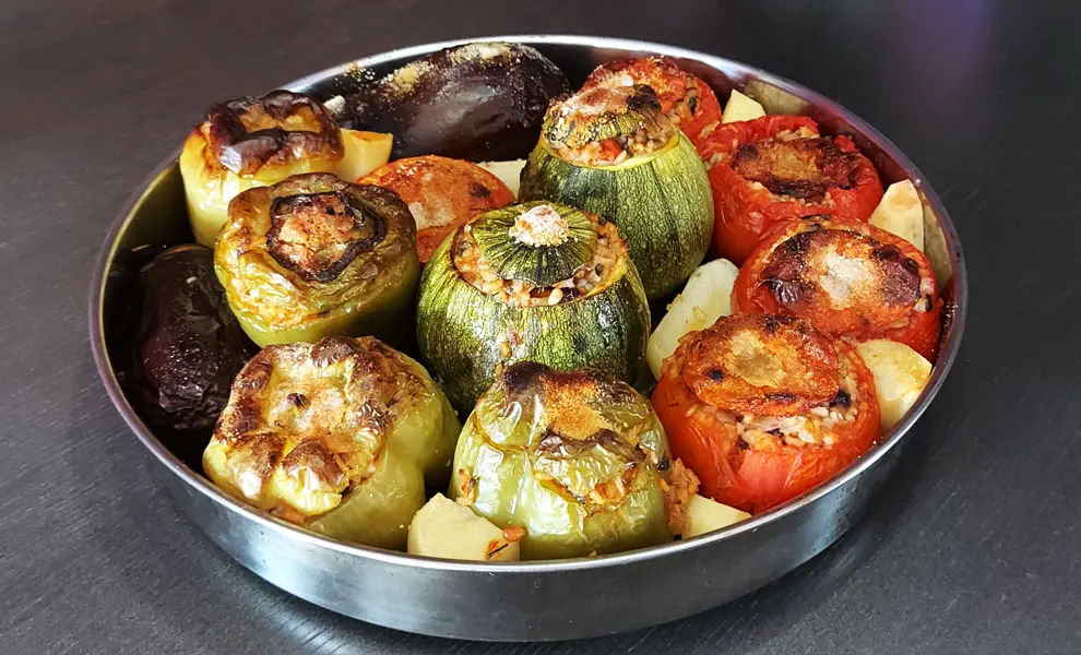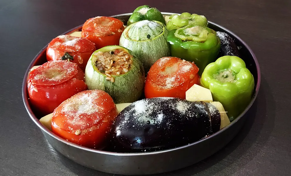 Стиглі помідори, солодкі перці, кабачки та баклажани наповнюються ароматною сумішшю з рису, трав та овочевої м’якоті, а потім повільно запікаються в духовці. Рис вбирає всі соки, перетворюючись на найніжніше наповнення, що тане в роті, а овочі набувають неймовірної солодкості та м’якості.