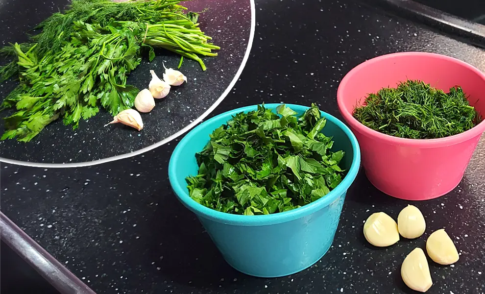 - Посипте зеленню. Вилийте оливкову олію, що залишилася. Перемішайте. Начинка готова.