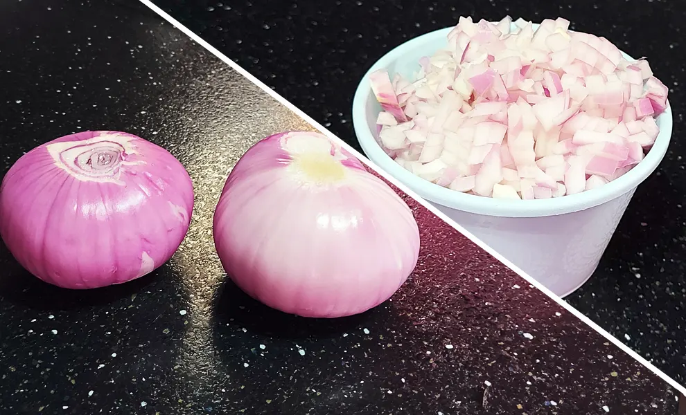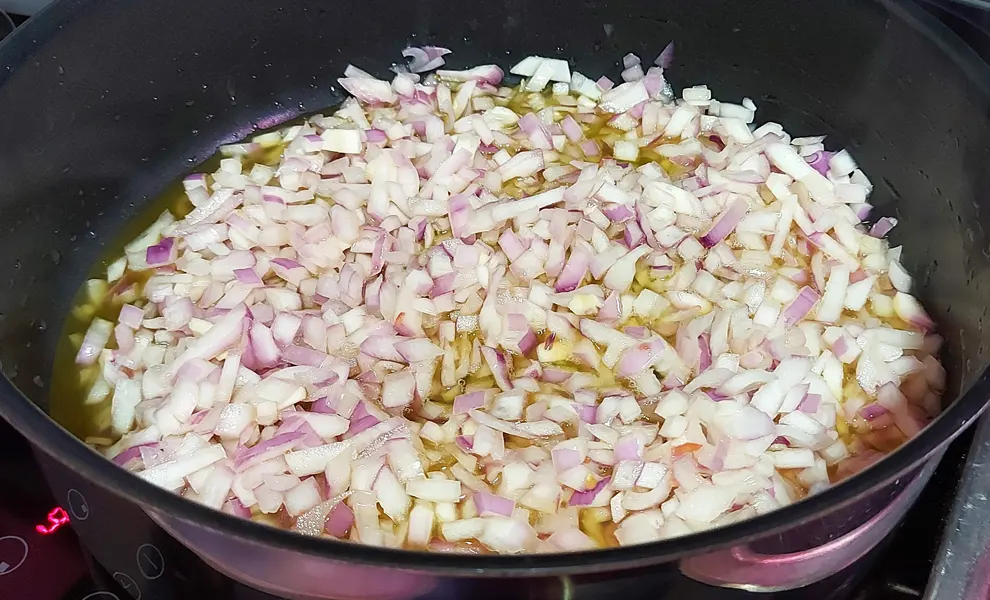 - Налийте в сковороду третю частину оливкової олії, розігрійте на сильному вогні та обсмажте трохи цибулю. Приблизно 5 хвилин.
