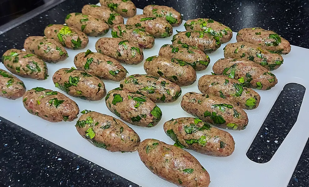 - Складіть у миску всі інгредієнти для фаршу і ретельно перемішайте. Руки змастіть оливковою олією, сформуйте судзукак’я, вони мають бути маленькими (25-27 г), вузькими й довгими. З цієї кількості фаршу вийде до 50 шт.