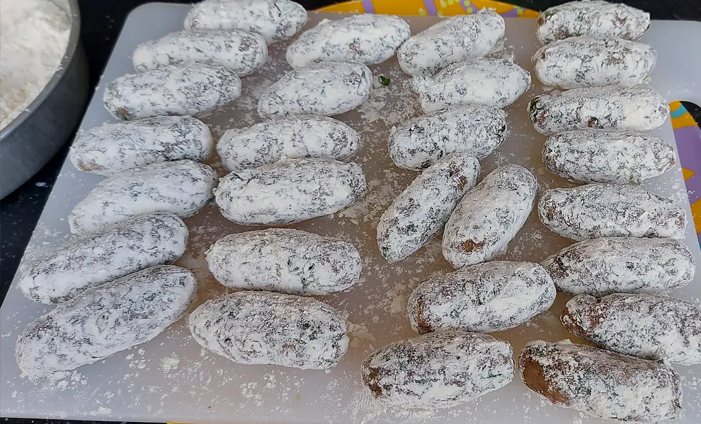 - Обваляйте судзукак’я в борошні. Обсмажте на розігрітій олії 3 хвилини з одного боку, переверніть і ще 2 хвилини з іншого.
