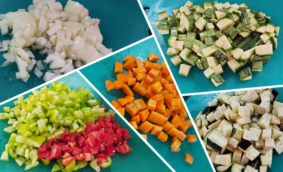- Наріжте баклажан, кабачки, моркву, цибулю, червоний та зелений перці дрібними кубиками.