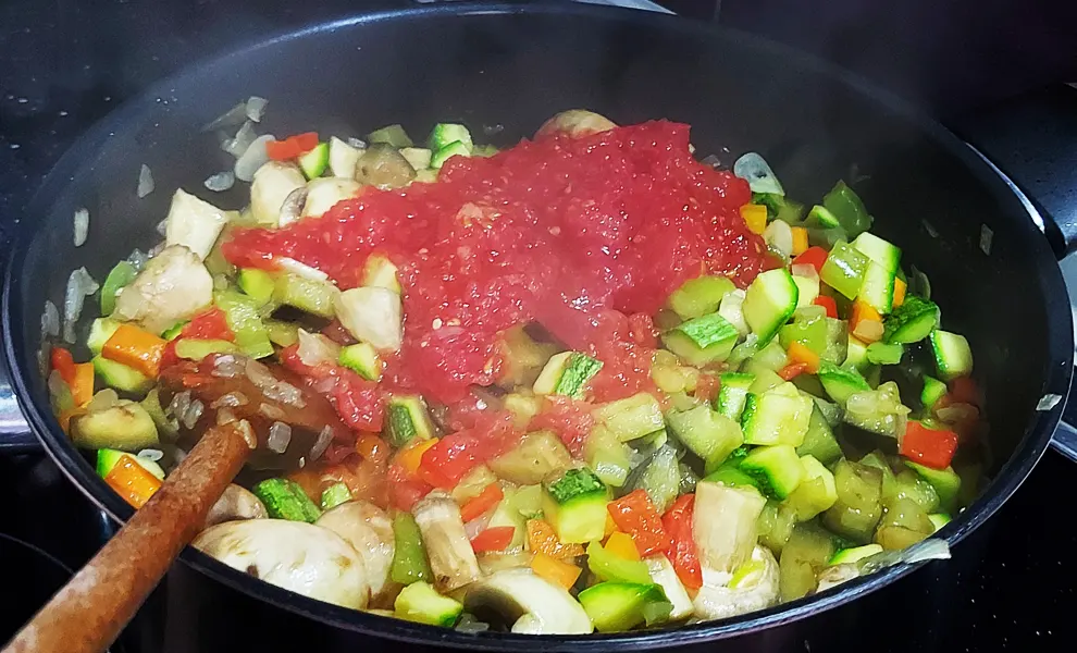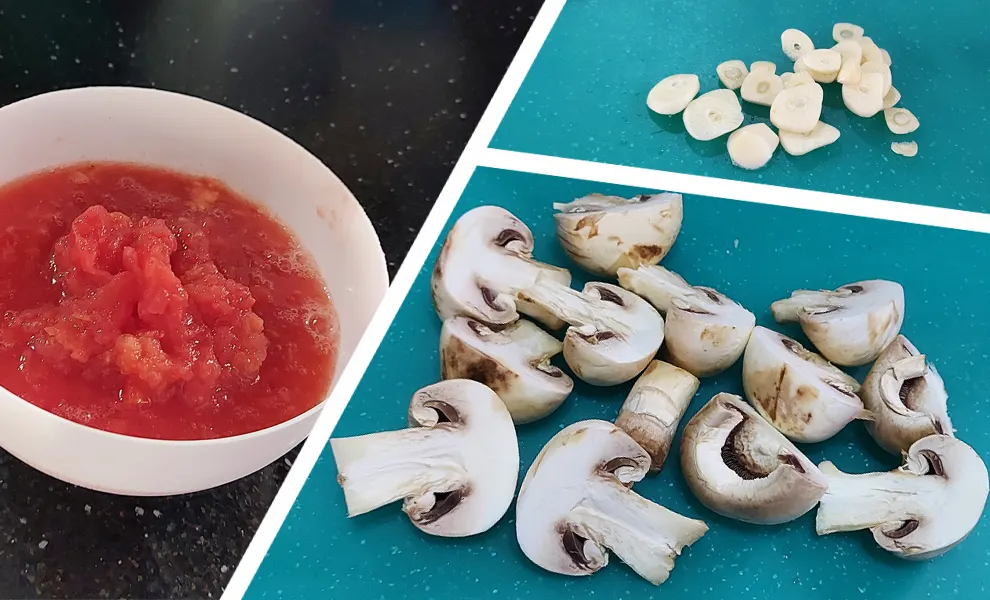 - Далі додайте часник і гриби, злегка обсмажте та додайте протерті томати. Цукор, доданий на початку, збалансує кислотність помідорів.