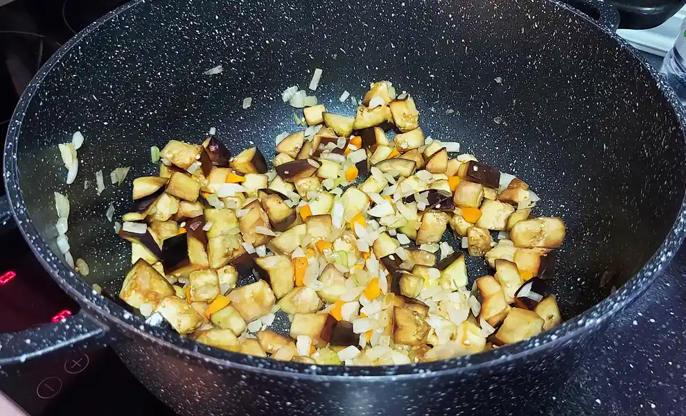 - Потім додайте кубики баклажана і готуйте 3–4 хвилини, періодично помішуючи.