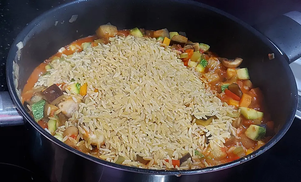 - Через 2 хвилини додайте воду, овочевий бульон, перемішайте, накрийте кришкою і варіть 15 хвилин на середньому вогні.