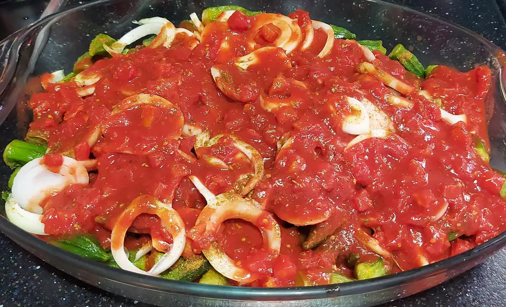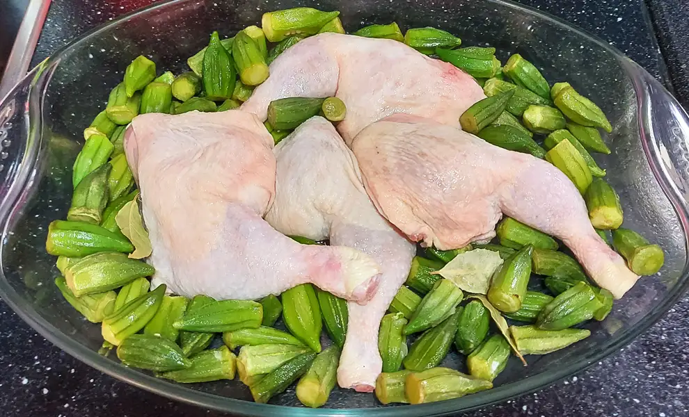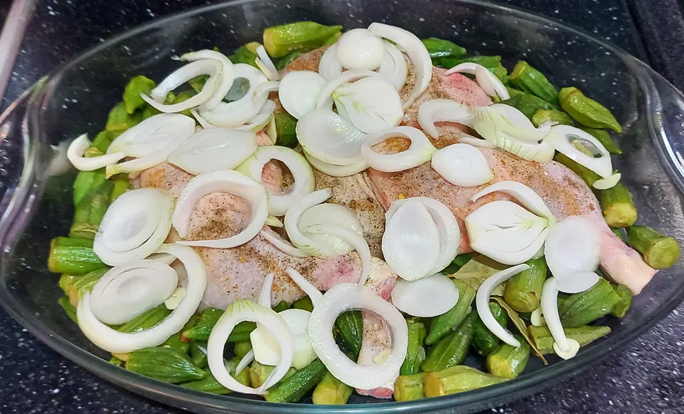 - У форму для запікання (наприклад, скляну або керамічну) викладіть курячі стегенця в центр, а навколо акуратно розподіліть бамію. Не перемішуйте, щоб не пошкодити її структуру.