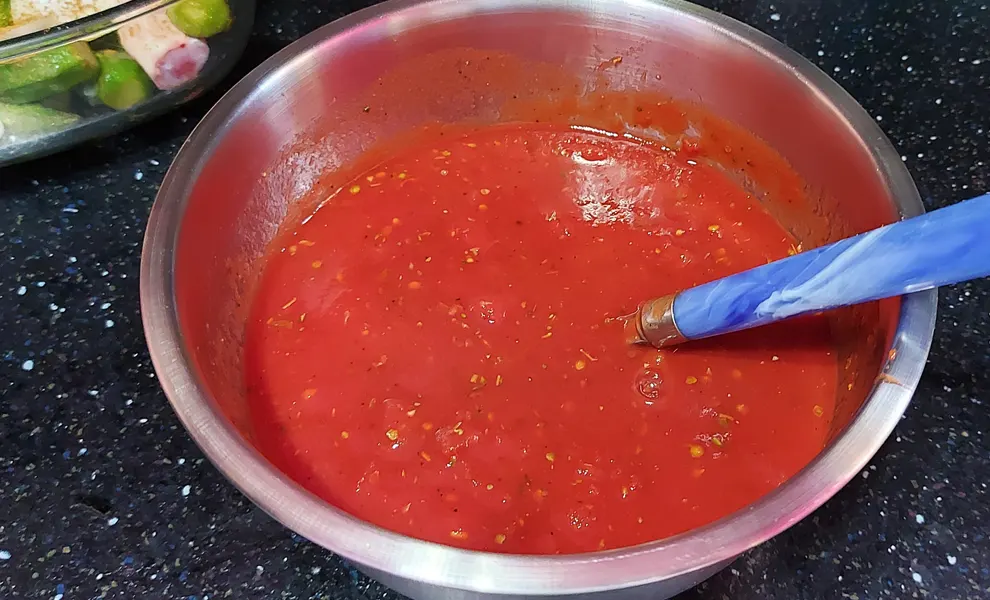 - В окремій ємності змішайте помідори, томатну пасту, воду, цукор, сіль і перець. Добре перемішайте.
