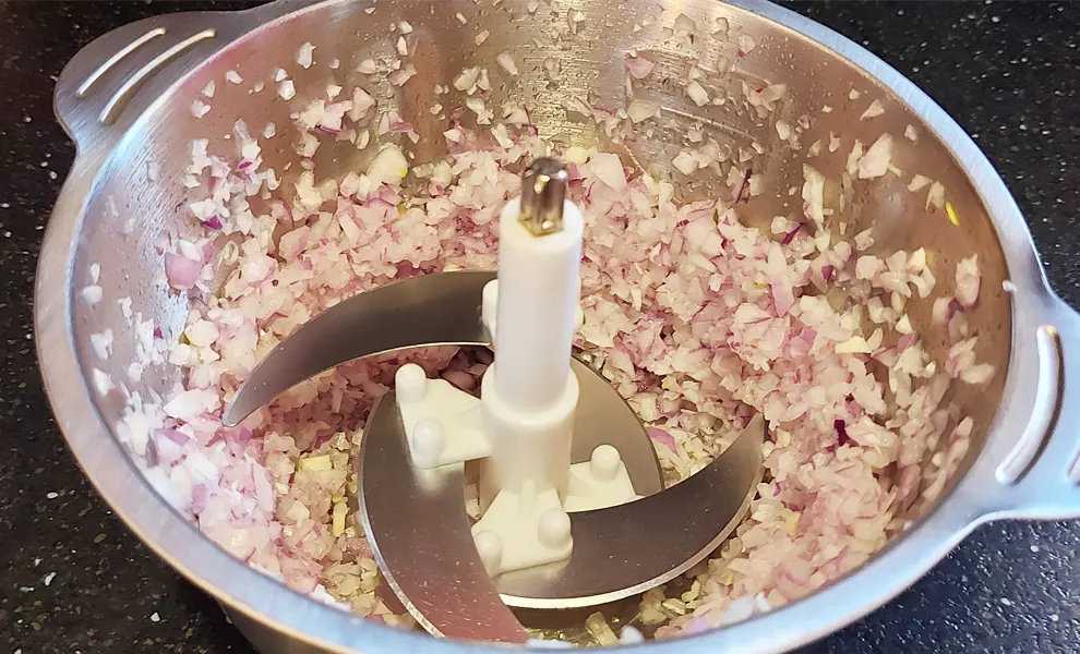 - Подрібніть цибулю у блендері на дрібні шматочки. Часник можна подрібнити разом із цибулею або нарізати пластинками.