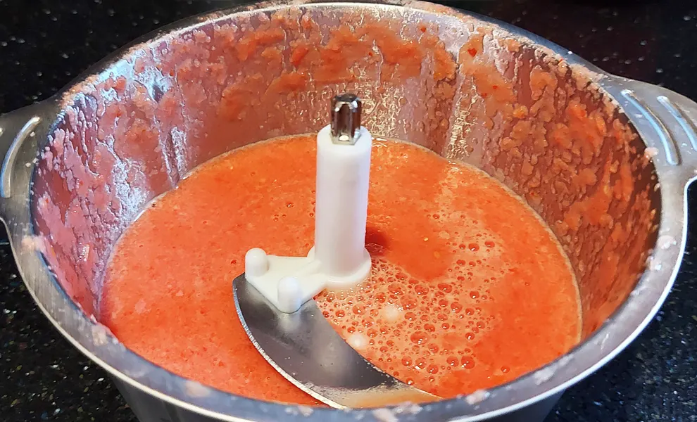 - Також подрібніть помідори у блендері до однорідного стану.
