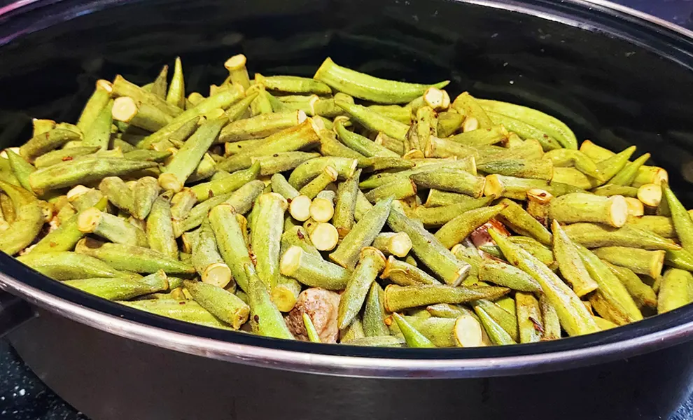 - Перекладіть курку в гусятницю, а на сковорідку додайте олії та викладіть свіжу або заморожену бамію. Обсмажте, обережно помішуючи, приблизно 5 хвилин. Після цього перекладіть бамію в гусятницю поверх курки.