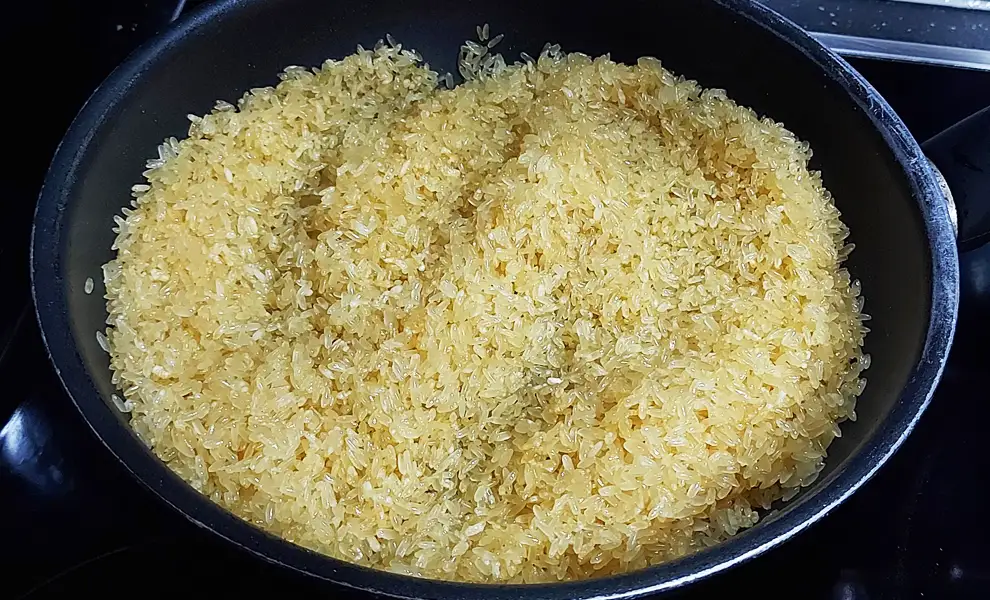 - Окремо у невелику сковорідку налийте трохи оливкової олії та злегка обсмажте рис до прозорості зерен.
