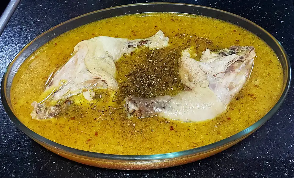 - Перекладіть рис у жаротривку форму (наприклад, Pyrex). Залийте гарячим курячим бульйоном у пропорції 1:2 (на 2 склянки рису — 4 склянки бульйону). Додайте в бульйон куркуму, імбир та сушений орегано. Перемішайте. Сверху викладіть відварені стегенця зворотною стороною. Накрийте форму пергаментним папером. Запікайте у попередньо розігрітій духовці при 180°C близько 30 хвилин.