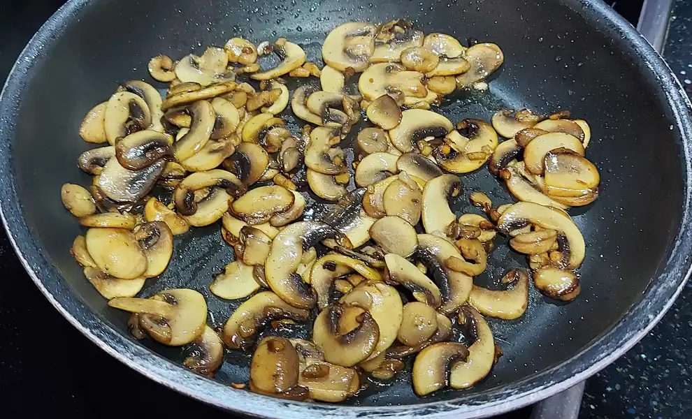 - За бажанням: у цей час наріжте печериці та обсмажте їх на сковороді з невеликою кількістю оливкової олії.