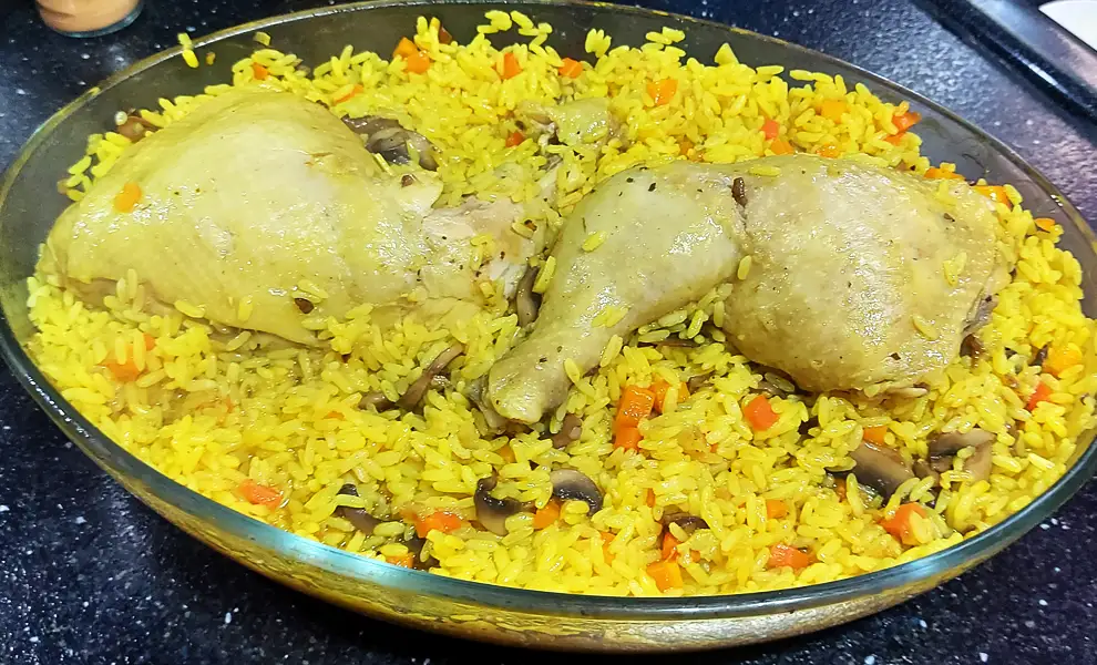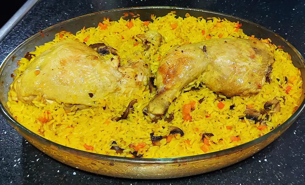 Простий і дуже смачний рецепт для сімейного обіду або вечері. В основі — соковиті курячі стегенця та ароматний розсипчастий рис із легкими східними нотками імбиру та куркуми.