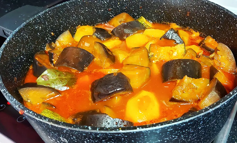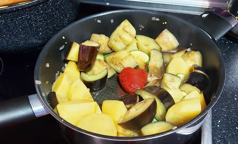 Скуштуйте овочі в особливому, медоподібному соусі (μελωμένη σάλτσα)! Він не містить меду, але завдяки повільному тушкуванню стає густим, оксамитовим і трохи солодкуватим. Такий соус обволікає шматочки картоплі, баклажанів і кабачка, перетворюючи їх на єдину гармонійну страву, від якої неможливо відірватися.