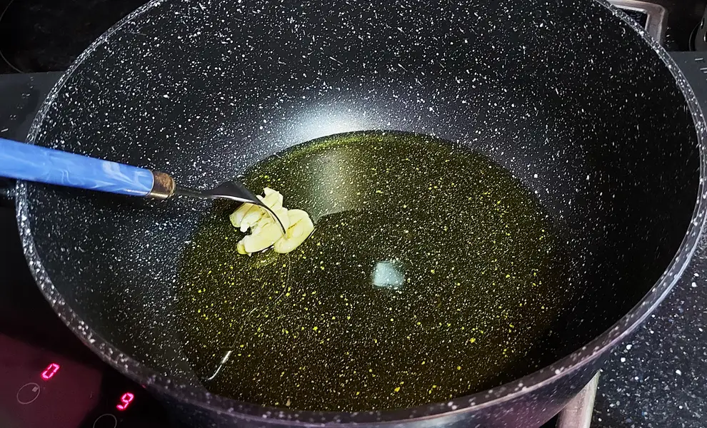 - Розігрійте в каструлі оливкову олію й обсмажте роздавлений часник протягом двох хвилин. Часник видаліть.