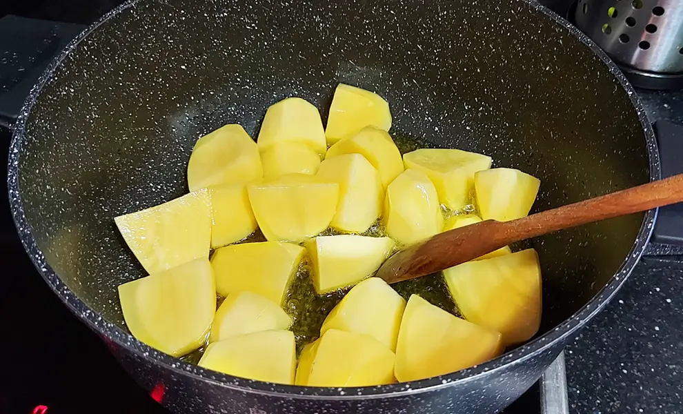 - Додайте картоплю й обсмажуйте близько 5 хвилин.