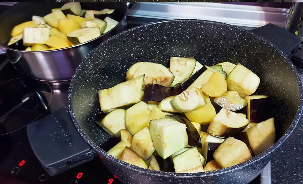 - Злийте воду з баклажанів та картоплі й обітріть паперовим рушником.