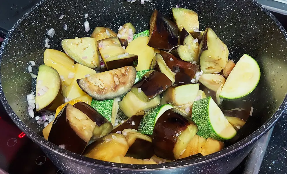 - Додайте баклажани та кабачки. Трохи обсмажте, акуратно перемішуючи. Якщо об’єм дуже великий, можна розділити на дві частини.