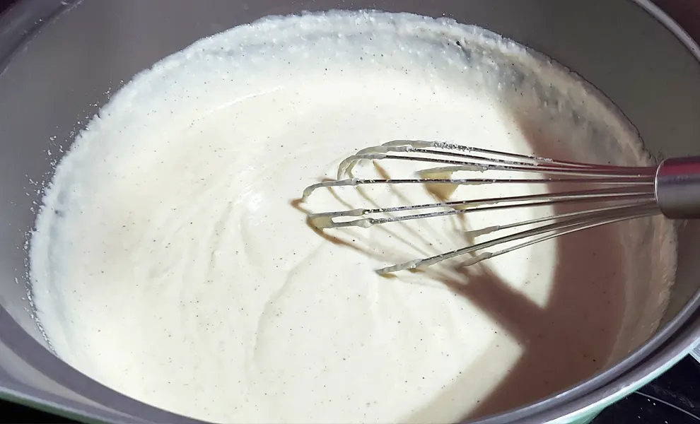 - У холодну каструлю вилийте молоко, додайте кукурудзяний крохмаль і добре перемішайте. Додайте шматок вершкового масла. Натріть на дрібній тертці трохи мускатного горіха. Увімкніть плиту і на сильному вогні постійно перемішуючи протягом декількох хвилин доведіть суміш до кипіння. Крем має загуснути. Як тільки соус Бешамель закипить, зніміть з вогню і дайте охолонути протягом 5 хвилин. Додайте акуратно збиті яйця при швидкому перемішуванні вінчиком. Додайте сир Кефалотірі і добре перемішайте.