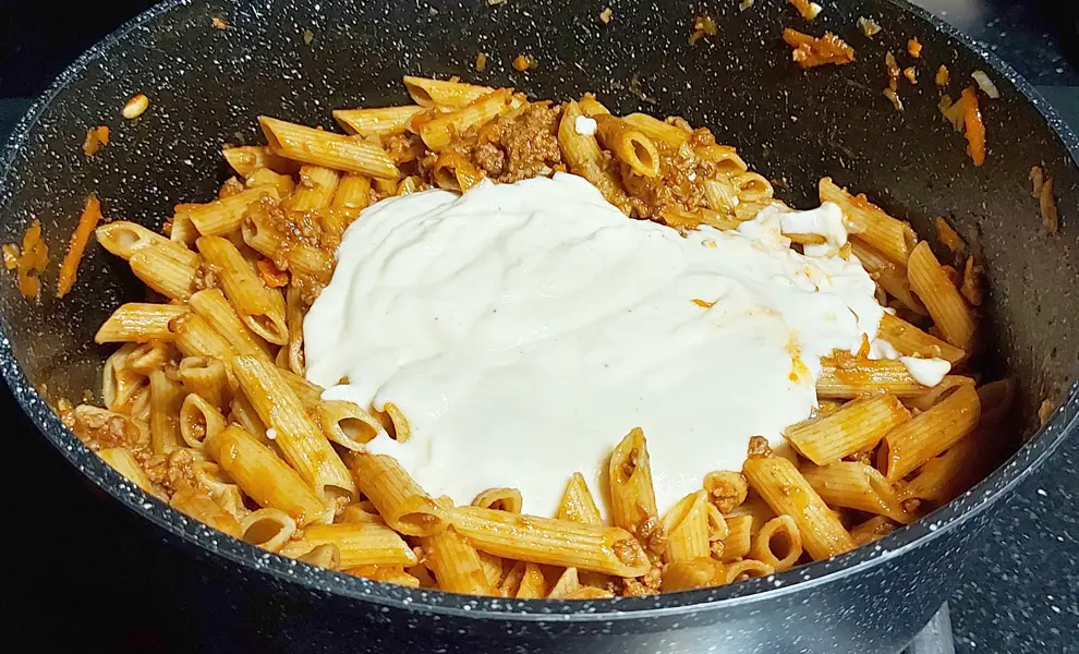 - Приберіть із фаршу лавровий лист і паличку кориці, додайте пасту Пенне Рігате і добре все перемішайте. Вилийте половину соусу Бешамель і додайте тертий сир.