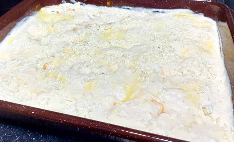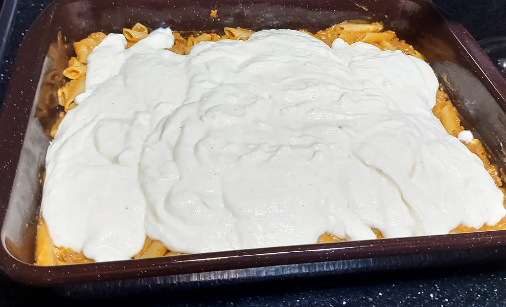 - Перенесіть усю суміш у велику форму для запікання, змащену маслом. Рівномірно розрівняйте її лопаточкою. Додайте крем Бешамель, що залишився, і теж розрівняйте по всій поверхні.