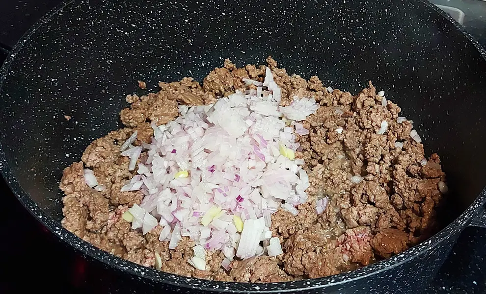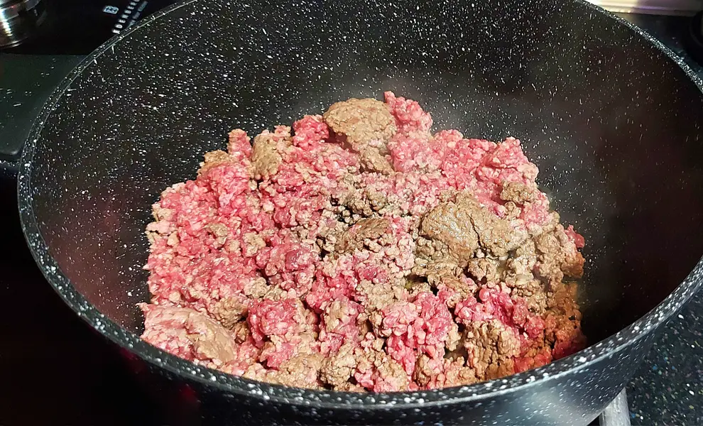 - У каструлю додайте оливкову олію й обсмажте фарш до зміни кольору. Не розминайте його на дрібні шматочки, а акуратно перевертайте на інший бік.