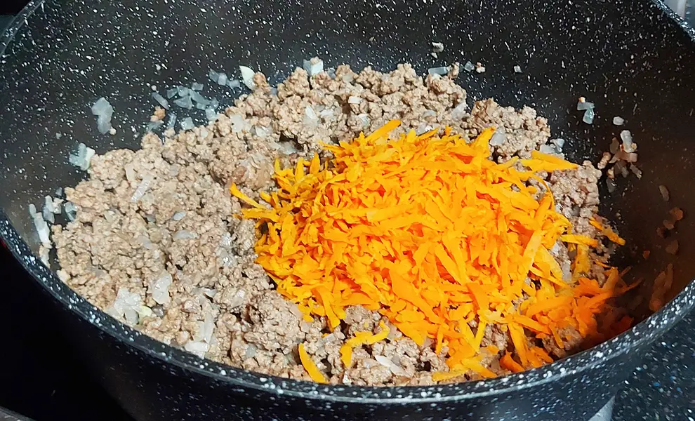 - Додайте моркву. Обсмажуйте 4 хвилини, щоб цибуля стала м’якою, але не змінила кольору.