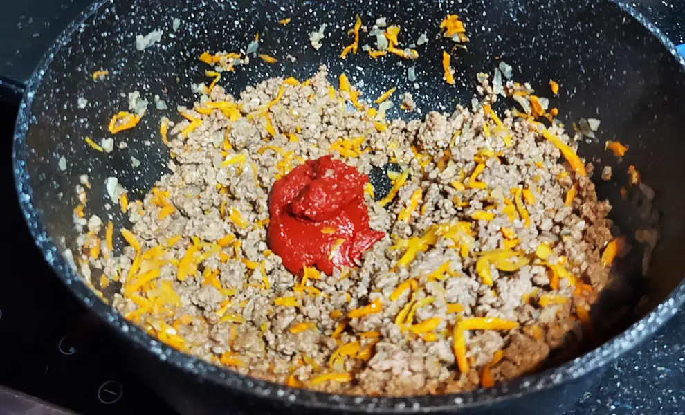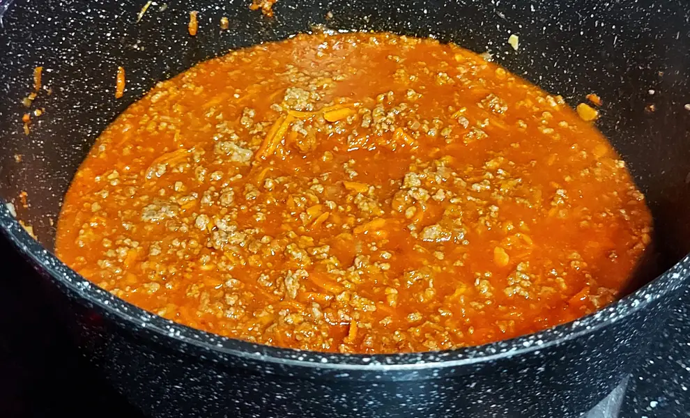 - Додайте терті помідори та гарячу воду. Накрийте кришкою і тушкуйте 30 хвилин на повільному вогні. Слідкуйте, щоб фарш не став сухим, за необхідності додайте трохи води. За п’ять хвилин до готовності додайте лавровий лист, паличку кориці, сіль, перець.