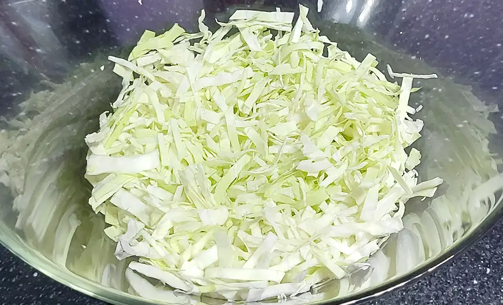 - Зніміть верхнє листя і тонко нашинкуйте капусту. Перекладіть її в глибоку салатницю і злегка розімніть руками з дрібкою солі, щоб вона стала м’якшою та пустила сік.