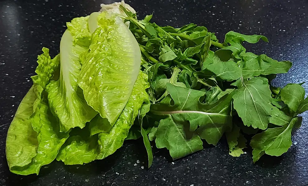 - Зелене листя салату та руколи ретельно вимийте.