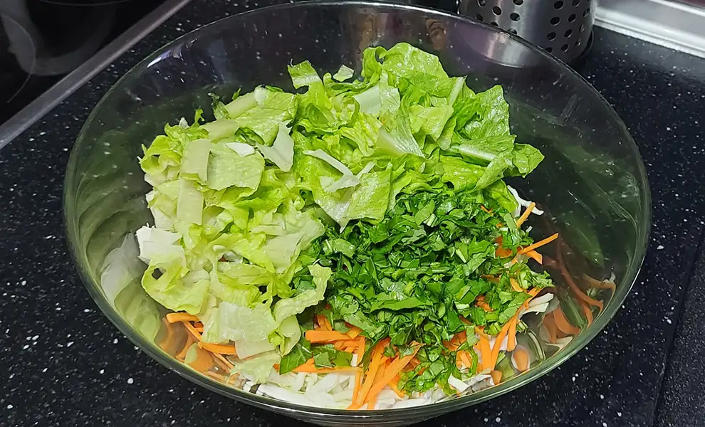Для цього салату краще взяти марулю з прямим листям, вона більш щільна з соковитою центральною жилкою. Можна використовувати й ніжне кучеряве листя.