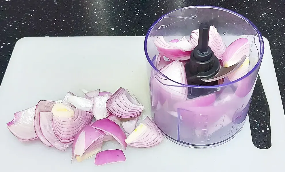- Измельчите в блендере лук и помидор.