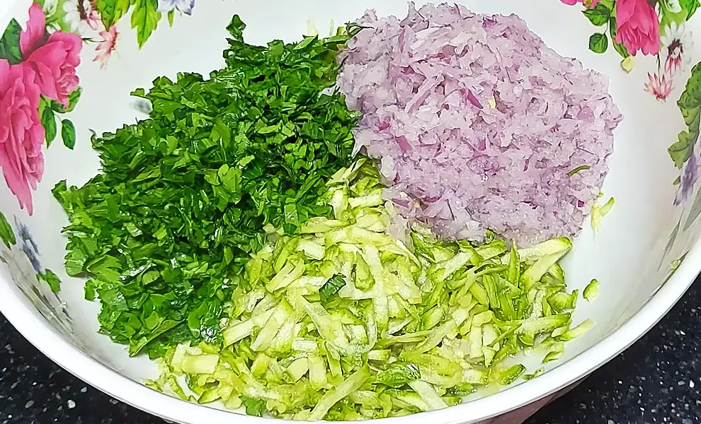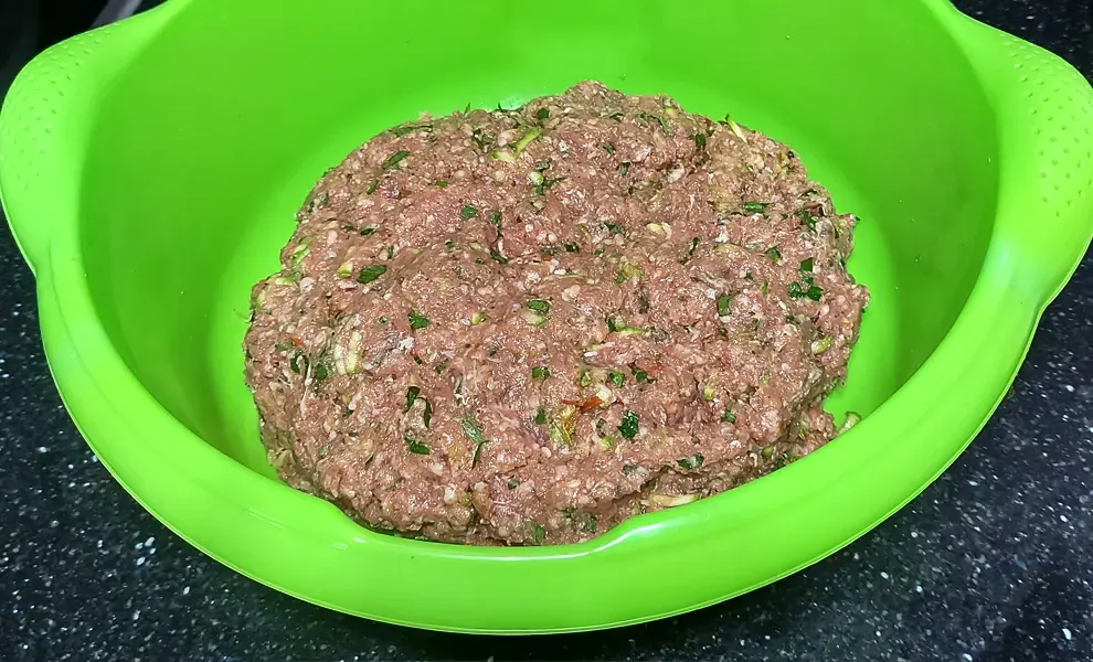 - В фарш добавьте кабачок, картофель, лук, помидор, петрушку, яйцо, овсянку, панировочные сухари, орегано, соль, перец. Тщательно перемешайте, накройте плёнкой и поставьте в холодильник на полчаса.