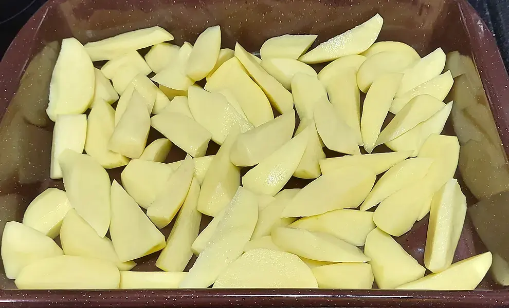 - Картофель почистите и нарежьте дольками, сложите в противень.