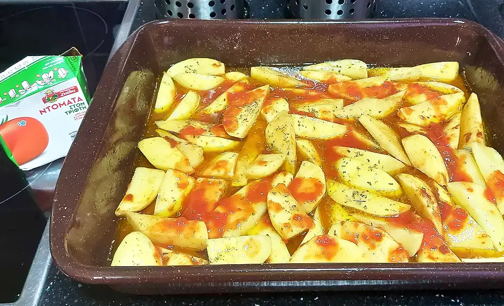 - Добавьте оливковое масло, соль, перец, орегано, томатную пасту, перетёртые помидоры, апельсиновый сок, воду и хорошо перемешайте. Накройте фольгой и отправьте в духовку на 20-30 минут. Готовьте в нижней части духовки с циркуляцией воздуха при температуре 170 градусов. После чего уберите фольгу. Картошка должна быть почти готовой.