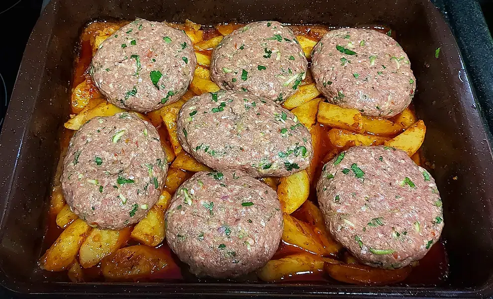 - Выложите бифтеки поверх картофеля и отправьте в духовку ещё на 15 минут.