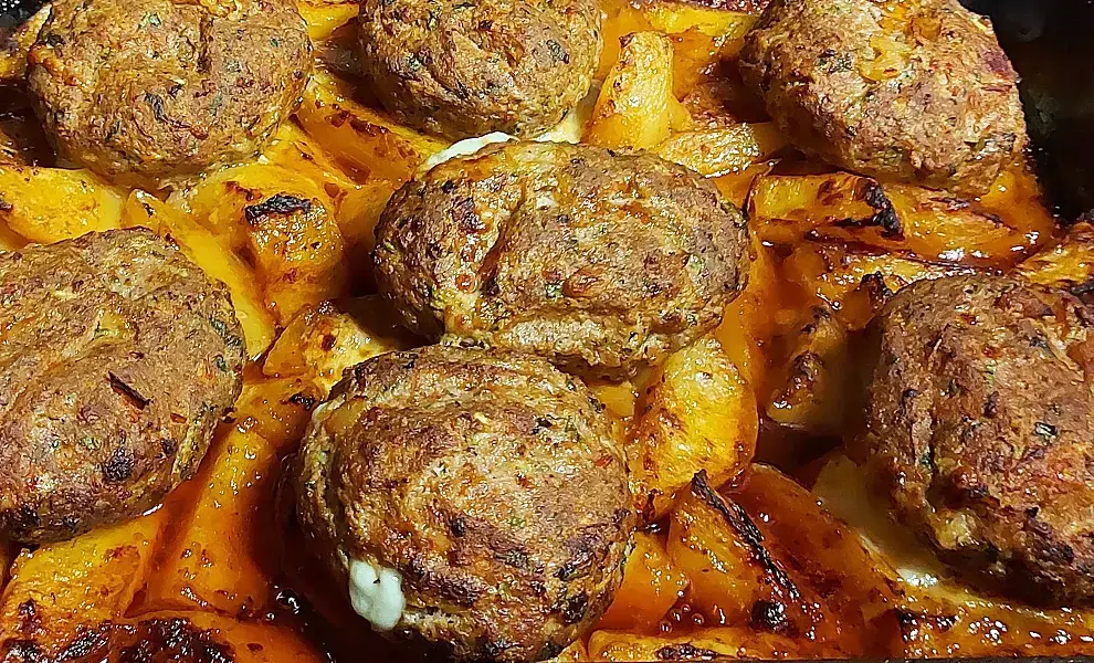 Приготовьте воздушные бифтеки, начинённые сыром и запечённые в духовке с картофелем в томатно-апельсиновом соке. Сочные котлеты пропитываются ароматами специй и цитрусовых, в результате блюдо получается удивительно насыщенным.
