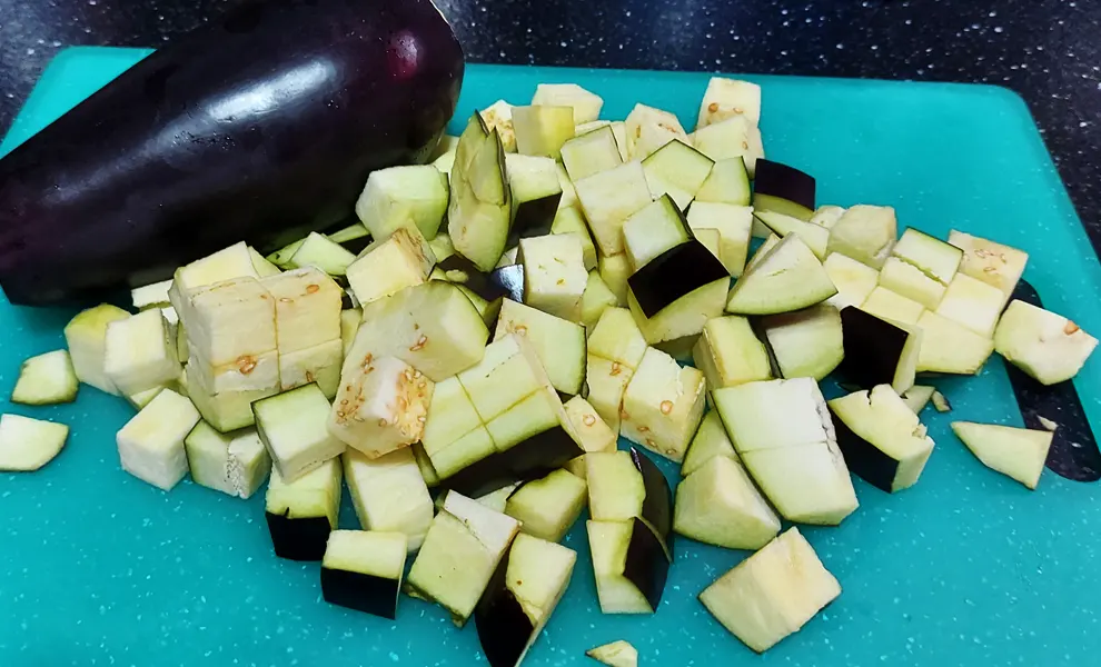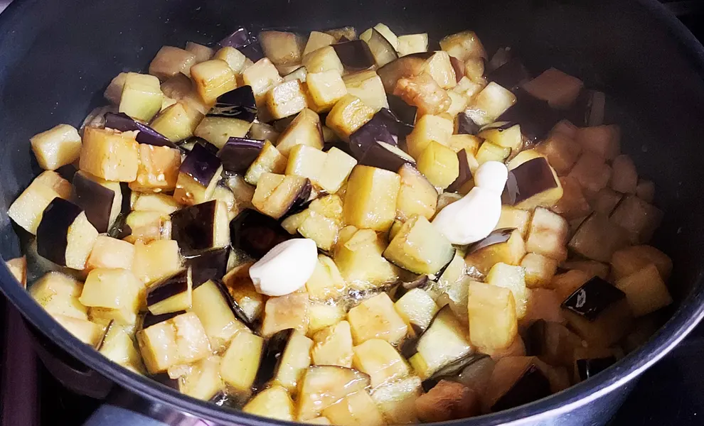 - Поставьте большую глубокую сковороду на сильный огонь, добавьте оливковое масло и дайте ему нагреться. Добавьте баклажаны, целые зубчики чеснока, соль и перец, перемешайте. Обжаривайте в течение 5–10 минут, пока баклажаны не станут румяными и мягкими.
