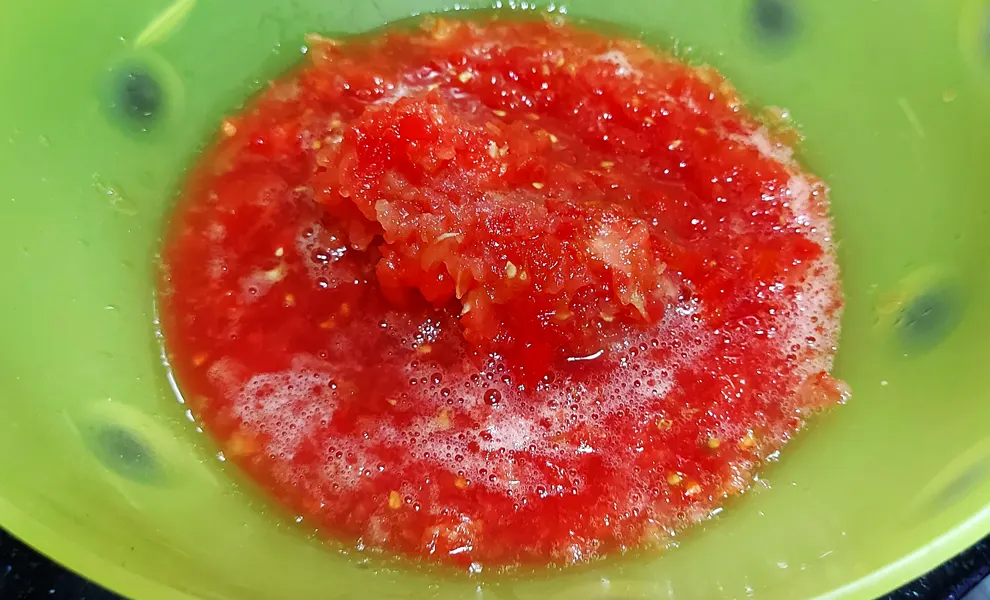 - Снимите кожицу с помидор и натрите их на крупной терке. Отставьте в сторону.