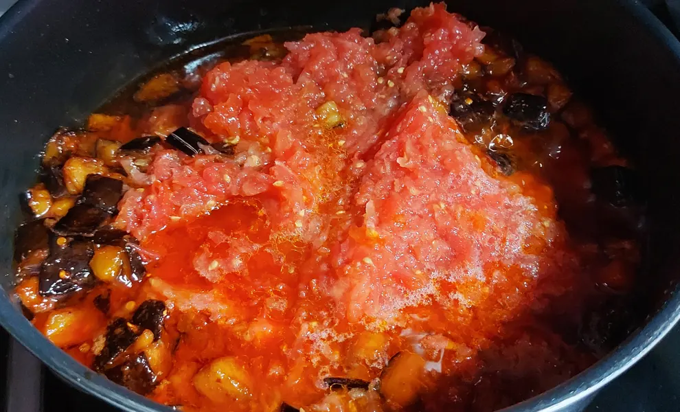 - Добавьте тёртые помидоры, бульонный кубик. Перемешайте.