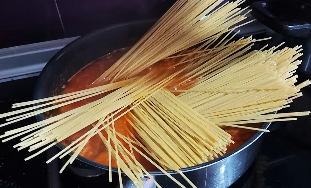 - Добавьте воду и сырые спагетти. Варите 12–15 минут, регулярно помешивая — спагетти должны свариться прямо в соусе.