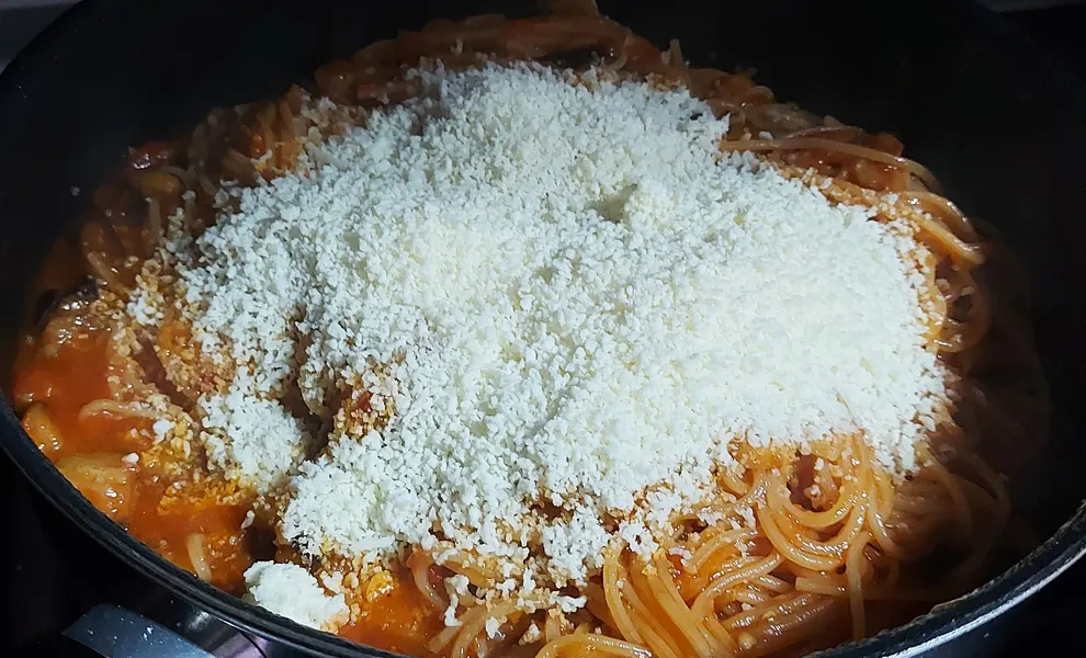 - Когда паста почти готова и соус стал густым, добавьте тёртый пармезан и хорошо перемешайте. У меня не было пармезана, положила кефалотири. Снимите с огня.