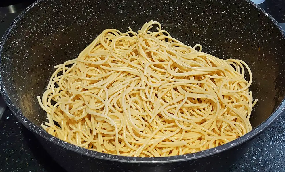 - Отварите спагетти до состояния al dente (на 1–2 минуты меньше, чем указано на упаковке). Откиньте пасту на дуршлаг, дайте воде полностью стечь, а затем верните макароны в кастрюлю. Сбрызните их небольшим количеством оливкового масла, чтобы они не слиплись, и накройте крышкой. Не промывайте макароны водой.