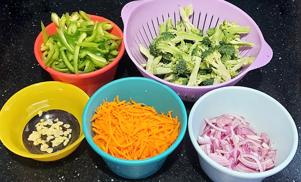 - Нарежьте сладкий перец, морковь и лук — тонкими полосками, брокколи — небольшими соцветиями, чеснок — пластинками.