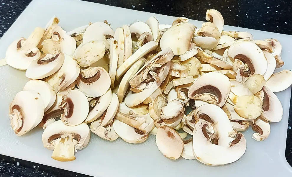 - Нарежьте шампиньоны тонкими ломтиками вместе с ножками или возьмите консервированные.