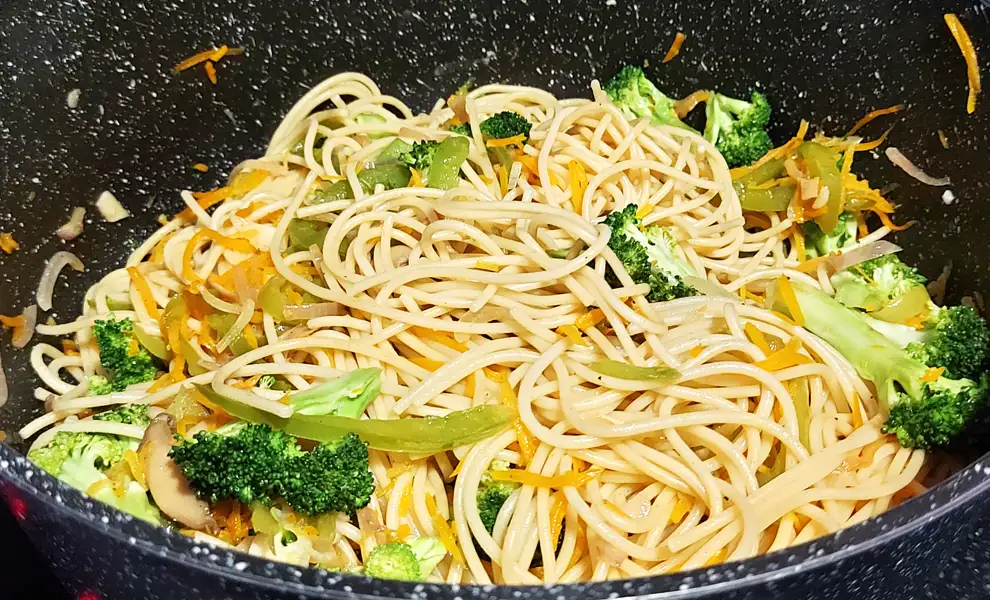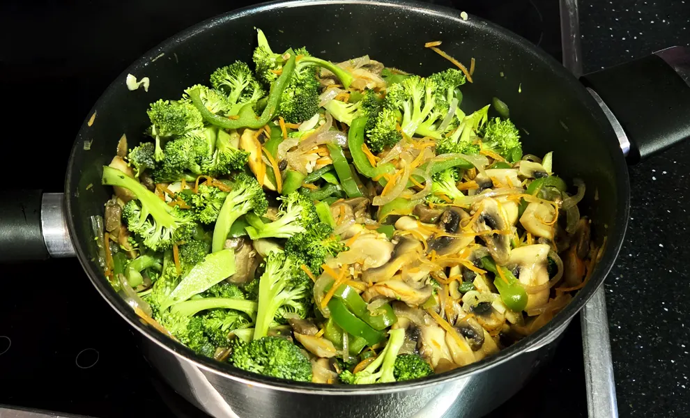 - Добавьте брокколи к овощам и готовьте ещё 3 минуты, помешивая.